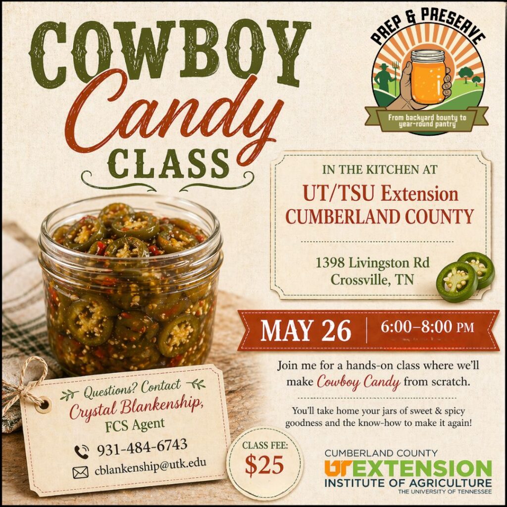 Join us on May 26 at 5:30 PM at the Country Store for our Cowboy Candy class! In this hands-on workshop, you’ll learn the fundamentals of safe water bath canning while making sweet-and-spicy candied jalapeños. We’ll cover proper preparation, processing times, and best practices so you can confidently preserve foods at home. Participants will leave with their own jar of Cowboy Candy and the skills to recreate it in their own kitchen. The cost is $25 per person, and space is limited to ensure a quality learning experience. Whether you’re brand new to canning or looking to try something a little different, this class is a fun place to start.