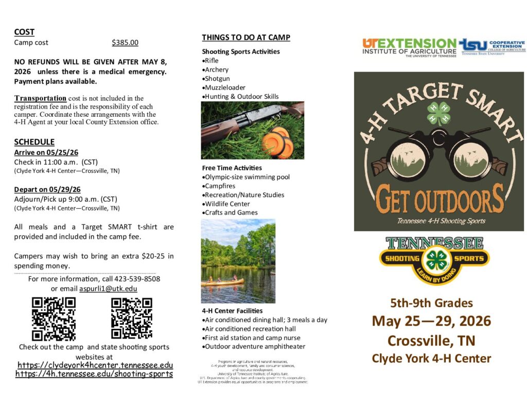 This overnight camp is for youth who are enrolled in grades five through nine as of the date of the camp. It is located at Clyde York 4-H Center in Crossville, Tennessee. At camp, youth learn appropriate skills to succeed in a variety of shooting sports and related areas, such as archery, riflery, shotgun use, muzzleloading, and outdoor skills.