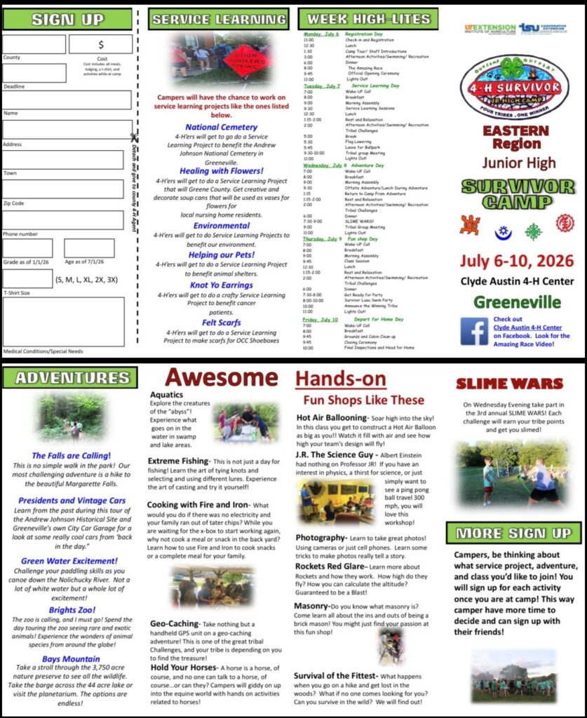 4-H Jr. High Adventure Camp is for older youth in Cumberland County who are in grades 6th – 8th (as of January 1, 2026). This camp offers adventure-type and active-engaged activities, and team challenges. Activities include fishing, tubing, nature hikes, canoeing, swimming, shooting sports, T-shirt airbrushing, survivor challenges, and more.