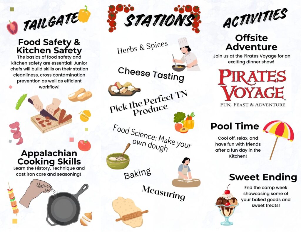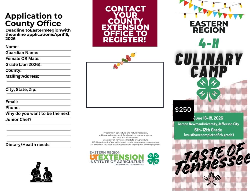 Culinary Camp is for students in the 6th-12th grades (must have completed the 6th grade). Students will learn all about cooking from Extension experts at Carson Newman. Transportation is on your own. If interested please call the Extension office at 931-484-6743.