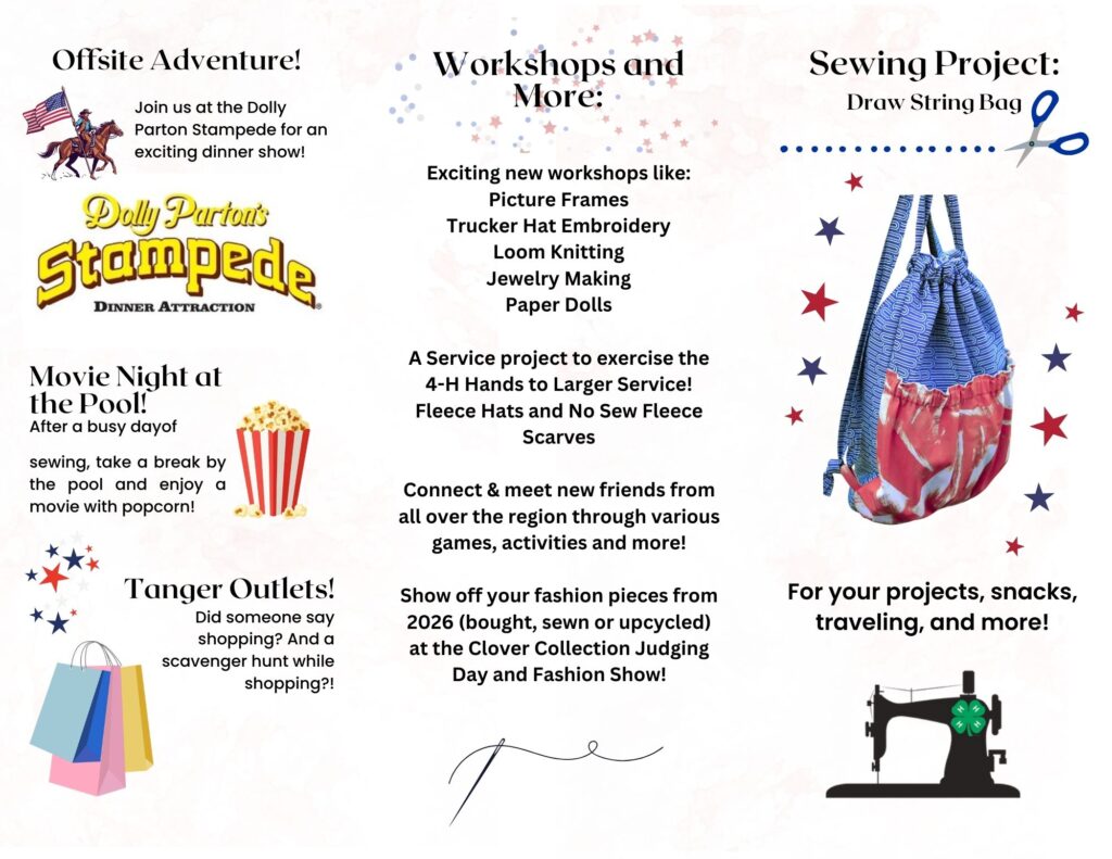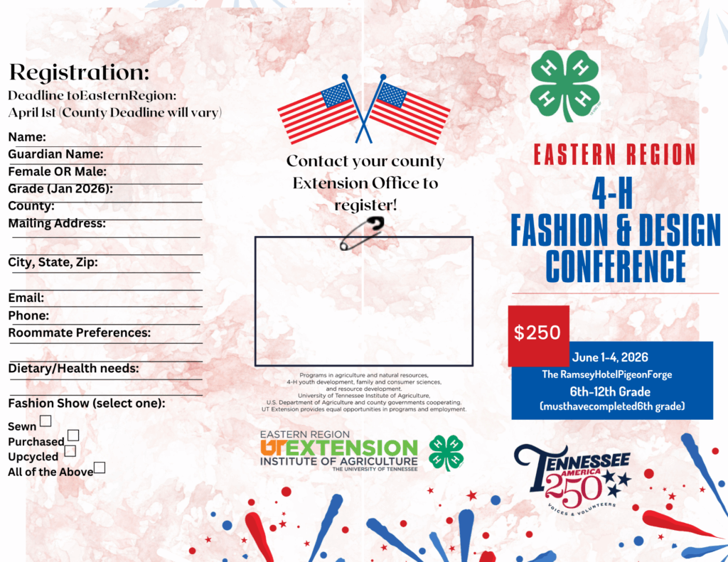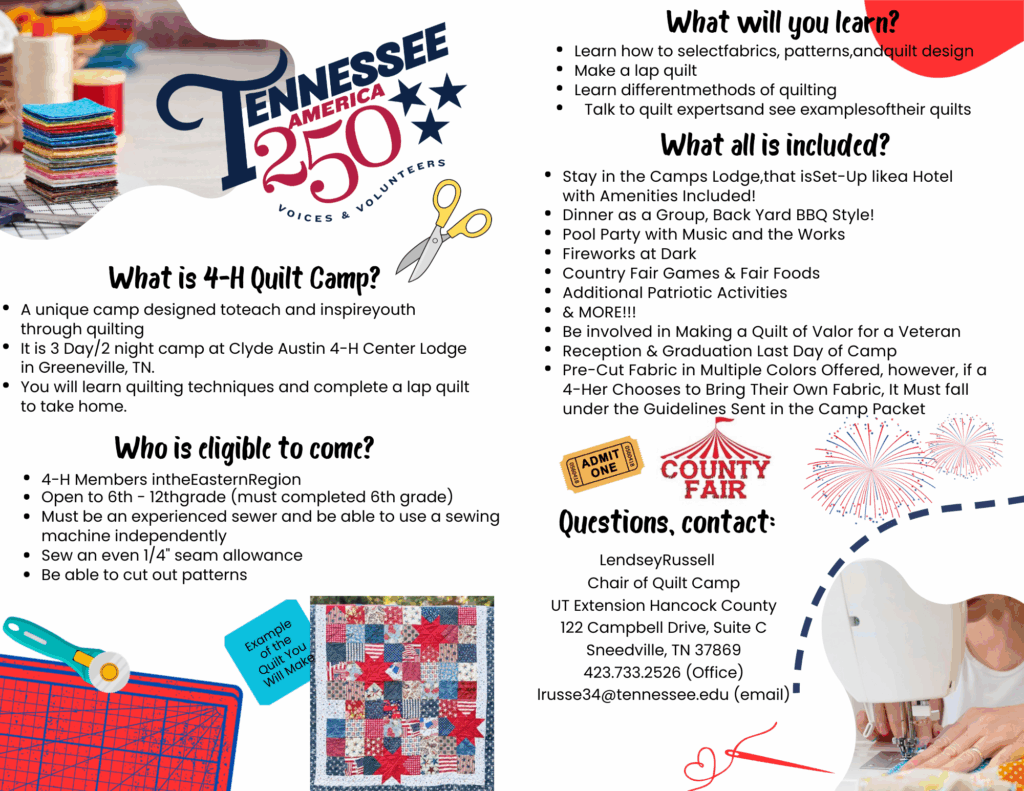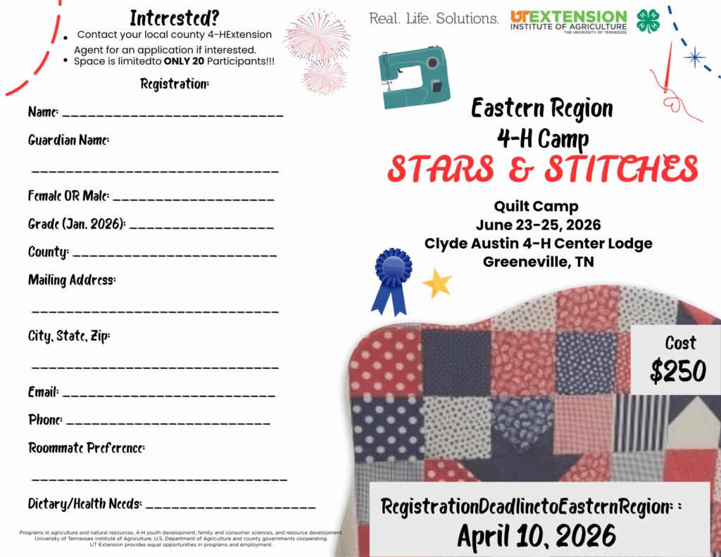 Students in the 6th-12th grades (must have completed the 6th grade). Students will complete a quilt from start to finish at the Clyde Austin 4-H Lodge in Greeneville TN at the 3 day, 2 night camp. Transportation is on your own. To register, call 931-484-6743.